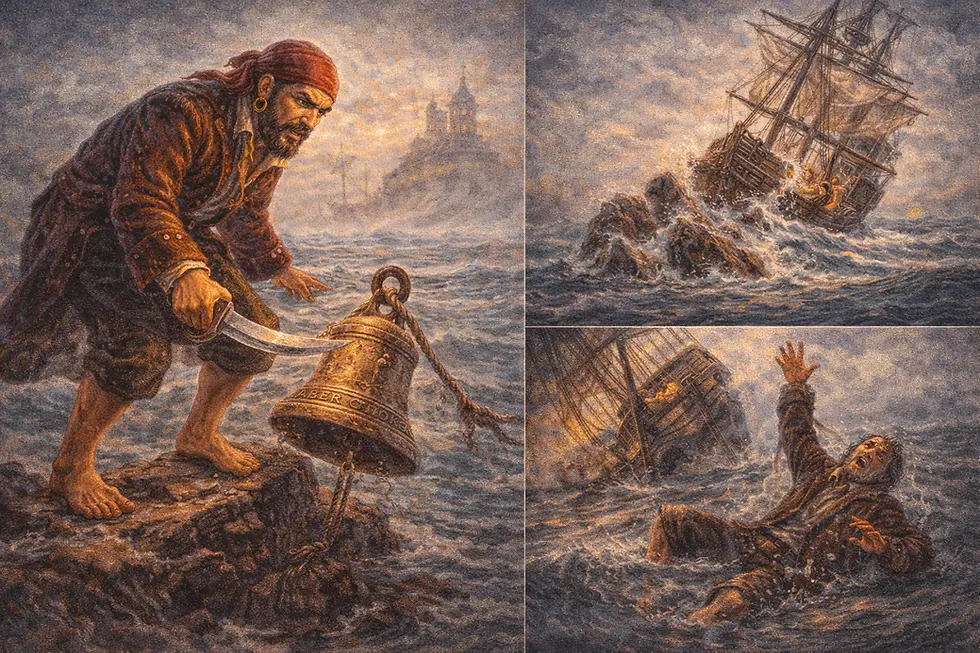 However, the wicked Sir Ralph the Rover, in a fit of jealousy and malice, decided to cut the bell from the buoy to "plague the Abbot" and destroy his good work. Years later, after amassing wealth through piracy, Sir Ralph's own ship sailed through a thick haze toward the same coast. Without the warning sound of the bell, the vessel struck the Inchcape Rock and began to sink. In his final moments, Sir Ralph heard a sound like the "knell" of the Inchcape Bell, realized his fatal mistake, and met his end in the same spot where he had committed his crime. The poem illustrates that "evil digs a pit for others but falls into the same".
