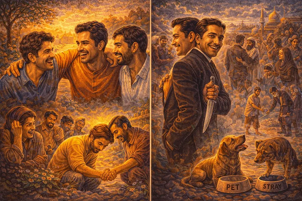 English: These ghazals highlight the true meaning of friendship and deliver a sharp satire on human hypocrisy and the double standards prevalent in modern society.